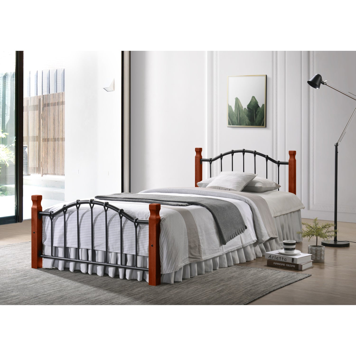 - Metal bed in a classic design with a stable and sturdy frame resistant to wear and tear over time and wooden legs-columns