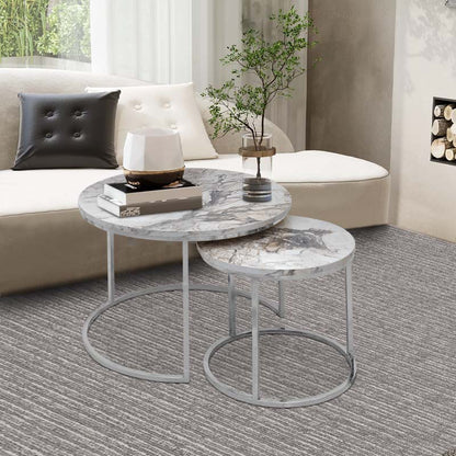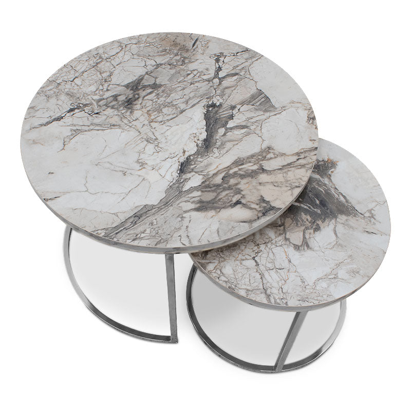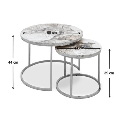 - Το σετ περιλαμβάνει δύο στρογγυλά τραπεζάκια, ένα μικρότερο κι ένα μεγαλύτερο.